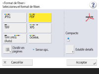 ![]() | Els originals llegits es converteixen a fitxers electrònics, com ara PDF. Seleccioneu el format de fitxer segons les vostres finalitats i l'entorn d'ús. |