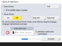 Comproveu la data i l'hora de l'equip. ![]() ![]() Introduïu la data i l'hora i premeu <Bé>. Establiu <Zona horària> i <Horari d'estiu> com calgui. Per a més informació, vegeu Configuració de la data i l'hora. | |