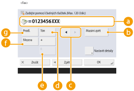 1 | Zadejte faxové číslo. ![]() Pole pro faxové čísloZadejte faxové číslo pomocí číselných tlačítek. Zadejte až podle potřeby. <Mazání zpět> Pomocí této volby můžete v poli pro faxové číslo ( ) po jednom mazat čísla nalevo od kurzoru.![]() /![]() Stiskněte, chcete-li přesunout kurzor v poli pro faxové číslo ( ) doleva nebo doprava. <Tón>Stisknutím tohoto tlačítka vložíte znak „T“ (tónová). I když používáte impulzní volbu, čísla následující po „T“ budou odeslána s použitím tónové volby. Tlačítko <R>Je-li zařízení připojeno k soukromé pobočkové ústředně (PBX – Private Branch Exchange), stiskněte toto tlačítko před zadáním místa určení. Není-li toto tlačítko k dispozici, je nutné uložit nastavení tlačítka R. <Nastavení tl. R> <Mezera>S pomocí tohoto tlačítka můžete mezi čísla zadat mezeru, aby jejich čtení bylo snadnější. <Prodl.>Stisknutím tohoto tlačítka vložíte znak „P“ (prodleva). Při odesílání faxu do zahraničí, vložte za mezinárodní přístupový kód nebo faxové číslo prodlevy. To napomůže zlepšení spojení. ![]() Na začátek čísla nemůžete vložit prodlevu. |
