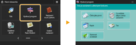 Zobrazte si průvodce funkcemiStisknutím <Výukový program> můžete zobrazit obrazovku, na níž najdete vysvětlení, co můžete dělat s funkcemi stroje, a také tipy pro použití funkcí kopírování, skenování atd. Vyvolejte tuto obrazovku, chcete-li se dovědět, které funkce jsou na stroji k dispozici a jak je používat. Příklad: Výukový program pro kopírovací funkce Po výběru funkce položky ze seznamu se zobrazí obrazovka výukového programu. Používejte funkci nápovědyV případě některých zobrazených funkcí je v pravé horní části obrazovky zobrazeno tlačítko  . Po stisknutí  se můžete seznámit s popisem a způsobem použití dané funkce. Stisknutím tlačítka <Konec> se vrátíte na předchozí obrazovku. Používejte stejný způsob ovládání jako na smartphonu (rychlý pohyb prstem / přetažení)Na některých obrazovkách můžete přepnout stránku nebo přejít na položky přetřením obrazovky prstem nahoru/dolů nebo doleva/doprava, jak byste to dělali na smartphonu. Pokud je možnost <Obrátit barvy obrazovky> nastavena na <Zap>, nelze provádět operace rychlého pohybu prstem ani přetažení. <Obrátit barvy obrazovky>Na obrazovkách s pohyblivými tlačítky mohou být tlačítka přetahována a vkládána k jejich přesunutí. |