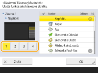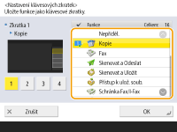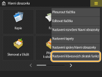 Pro funkce na obrazovce <Hlavní obrazovka> můžete vytvořit klávesové zkratky (tlačítka přímého přístupu). S pomocí této klávesové zkratky získáte přístup k jiné funkci, aniž byste se museli vracet na obrazovku <Hlavní obrazovka>. Chcete-li vytvořit klávesovou zkratku, přihlaste se do systému stroje s právy administrátora (správce).