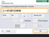 Odesílání faxů do zahraničíZadejte mezinárodní přístupové číslo, kód země a faxové číslo v tomto uvedeném pořadí. Nedaří-li se vám navázat spojení s místem určení v zahraničí, stisknutím <Prodl.> vložte prodlevu mezi číslo a další číslo. Odesílání faxů s podadresouStroj podporuje podadresy standardu ITU-T*. Jestliže faxový přístroj příjemce podporuje podadresy ITU-T, můžete zajistit ochranu odesílaných důvěrných dokumentů s pomocí podadresy a hesla. Pro odeslání dokumentu s podadresou zadejte faxové číslo, stiskněte <Podadresa> nebo <Nastavit detaily> a poté zadejte podadresu a heslo. * Tato zkratka znamená International Telecommunication Union-Telecommunication Standardization Sector, což je skupina, která vydává doporučení ke standardizaci telekomunikací na celém světě. |