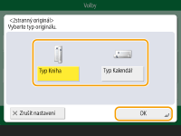 1 | Stiskněte <Smazání rámu knihy> a zkontrolujte <Velik. originálu>. ![]() Jestliže se velikost zobrazená v <Velik. originálu> liší od velikosti knihy, stiskněte <Změnit> a vyberte velikost. Režim Smazání rámu knihy můžete nastavit pouze pro velikosti originálu zobrazené na displeji dotekového panelu. |