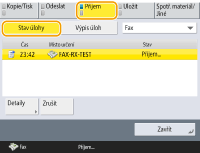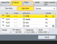 Stisknutím <Detaily> <Odeslat znovu> můžete opětovně odeslat dokumenty, jejichž odeslání se nezdařilo. Pro zadání dalšího místa určení stiskněte <Změnit místo určení>. Pro dokumenty, pro něž bylo zadáno více míst určení s použitím stejné metody odesílání, stiskněte <Seznam vysílání>, vyberte místo určení a poté stiskněte <Odeslat znovu> nebo <Změnit místo určení>.Dokumenty můžete opětovně odesílat, když je <Smazat chybné úlohy VYS.> nastaveno na <Vyp> (<Smazat chybné úlohy VYS.>). Upozornění. Opětovně nelze odesílat dokumenty odeslané s pomocí metod Přímé odesílání/Ruční odesílání/Faxování z počítače. Místa určení dokumentů, pro něž je nastaveno odesílání v zadaný čas, a také dokumentů, jejichž odeslání se nezdařilo, můžete změnit. Upozornění. Změnit nemůžete místa určení právě odesílaných dokumentů, pro něž bylo zadáno více míst určení, nebo když je zakázáno zadání nového místa určení (Omezení dostupných míst určení). Místo určení lze změnit pro úlohu, která byla zrušena z důvodu chyb při vysílání, nebo úlohu, která na odeslání čeká v režimu Odložené odesílání. Nelze měnit najednou více míst určení. Nelze také najednou měnit místa určení ve skupině. |