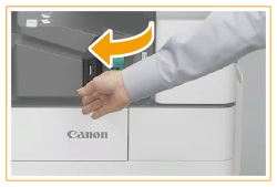 Sevřete dvě značky ve tvaru šipek na schránce na svorky a vyjměte ji ve směru šipky.