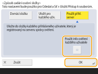 3 | Vyberte informace ověření, které se mají použít, a stiskněte <OK>. Chcete-li pro osobní složku používat samostatné uživatelské jméno a heslo, stisknutím <Použít info ověření každého uživatele> označte políčko zaškrtávacím znaménkem. Zaškrtávací znaménko odstraňte, chcete-li při přihlášení zadávat stejné uživatelské jméno a heslo. Je-li tato položka označena zaškrtávacím znaménkem, pro každého uživatele musí být uloženo uživatelské jméno a heslo. ![]() V domácí složce se vytvoří složka s následujícími jmény. Pokud je přidáno zaškrtnutí k položce <Použít info ověření každého uživatele>: uživatelské jméno zadané uživatelem Pokud není přidáno zaškrtnutí k položce <Použít info ověření každého uživatele>: uživatelské jméno použité pro přihlášení |