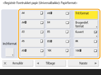 Hvis <Angiv altid> under <Standardindst. for Universalbakke> er indstillet til <Foretrukket papir>, vises en skærm, der giver dig mulighed for at vælge dit foretrukne papir, når lægger papiret i universalbakken. <Standardindst. for Universalbakke> |