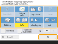 Registrering i <Favoritindst.>Du kan i <Favoritindst.> registrere ofte anvendte fremgangsmåder til kopiering samt ofte valgte modtagere og indstillinger til scanning. For flere informationer skal du se Registrering af en kombination af ofte anvendte funktioner. Ændring af standardindstillingen på skærmbilledet Grundlæggende funktionerNår du har ændret indstillingerne for hver funktion, kan du registrere de aktuelle indstillinger som en standard på skærmbilledet Grundlæggende funktioner ved at trykke på efterfulgt af <Skift standardindstillinger>. Hvis du logger på maskinen med personlig godkendelsesadministration (Logge på maskinen) inden udførelse af denne indstilling, bliver den registreret som din egen personlige standardindstilling (Liste over elementer, der kan tilpasses). |