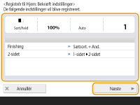 For at registrere en personlig knap skal du logge på med personlig godkendelsesadministration. Konfiguration af indstillingerne for personlig godkendelsesadministration Hvis du vælger <Info om enh. login-godk.> for <Anvendt info til filafsendelse/browsinggodkendelse>, gemmes der ikke et password for filmodtager i en personlig knap. <Anvendt info til filafsendelse/browsinggodkendelse> Når det gælder oplysninger om det maksimale antal personlige knapper og delte knapper, der kan registreres, kan du se under Administrationsfunktioner. Personlige knapper kan ikke ændres til delte knapper og omvendt. Det gør du ved at genkalde indstillingerne og registrere en anden knap fra <Menu>. Tryk på og hold en knap nede for at ændre dens navn/kommentere eller flytte/slette den. De samme handlinger (ændre navnet/kommentere en knap eller flytte/slette en knap) kan udføres fra <Menu> på <Hjem>-skærmen. Tilpasning af <Start>-skærmen Personlige knapper kan deles mellem forskellige enheder ved at synkronisere tilpassede data. Liste over elementer, der kan tilpasses Indstillinger, der kan registreres i personlige knapper/delte knapperFunktioner og indstillinger kan registreres i personlige knapper/delte knapper angives herunder. Indstillinger, der kan registreres i <Favoritindst.> for funktionen <Kopi> Reducering af antallet af kopihandlinger <Fax>-funktionsindstillinger for maskinen Grundlæggende betjeninger ved afsendelse af faxer Indstillinger, der kan registreres i <Favoritindst.> for funktionen <Scan og send> Praktiske scanningsfunktioner Indstillinger, der kan registreres i <Favoritindst.> for funktionen <Scan og gem> Indstilling af skærmbillede og betjening ved scanning til lagring Gem placeringer for funktionerne <Scan og gem> og <Se gemte filer> Brug af lagerplads Genveje til skærmen Grundlæggende funktioner for funktionen <Fax/I-faxindbakke> Adgang til en server og login-adgangskoden kan registreres til personlige knapper/delte knapper. Dette er praktisk til overspringning af indtastning af adgangskode, når den registrerede knap hentes. Hvis du vil indstille password i de indstillinger, der er gemt i den registrerede knap, da du ofte importerer indstillinger i en Personlig-knap eller en Delt-knap til en anden maskine, og du vil forhindre, at brugere udgiver sig for en anden person, skal du ikke medtage et password ved registrering. Import/eksport af de registrerede knapperDu kan importere og eksportere de registrerede personlige/delte knapper fra Remote UI (Brugerinterface til fjernbetjening). Import/eksport af alle indstillinger De personlige knapper/delte knapper til enheder i imageRUNNER ADVANCE-serien, der har Quick-menu-funktionen, kan blive importeret/eksporteret som personlige knapper/delte knapper. |