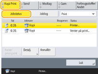 Hvis du trykker på på kontrolpanelet, når der venter kopijob, sættes alle kopijobbene på pause, og derefter vises meddelelsen <<Stop>Angiv det kopijob, du vil annullere.> og listen over kopijobbene. Du kan vælge et kopijob på listen og annullere kopijobbet ved at trykke på <Annullér>. Hvis du vil genoptager kopieringen, skal du trykke på <Genopt. kop.>. |