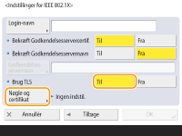 1 | Tryk på <Til> for <Brug TLS>, og tryk på <Nøgle og certifikat>. |