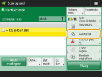 Tjek af det samlede antal angivne modtagere.Det totale antal angivne modtagere vises øverst til højre på skærmen. Derved kan du bekræfte, at antal modtagere er korrekt inden afsendelse. ![]() Sådan annullerer du straks et job, der sendesHvis du trykker på på betjeningspanelet, mens et job sendes, vises meddelelsen <Er det OK at annullere følgende sendejob?>. Tryk på <Ja> for at annullere afsendelse.Du kan vælge <Sidste modtagne job> eller <Job sendes> for at vælge det job, der skal annulleres. <Job, som skal annulleres, når der trykkes på Stop> Tryk på , når der er flere afsendelsesjob, for at vise skærmbilledet til valg af det afsendelsesjob, der skal annulleres. Hvis det afsendelsesjob, du vil annullere, ikke vises, skal du trykke på <Kontrollér andre job> for at vise <Sendejob>. Vælg det job, som du vil annullere, og tryk på <Annullér>.Sådan tjekkes statusserne for sendte/lagrede dokumenterPå skærmbilledet <Status Monitor> kan du tjekke statussen for sendte/lagrede dokumenter. Fra dette skærmbillede kan du sende/gemme dokumenter igen eller annullere afsendelse/lagring, når du har tjekket statussen. Kontrol af status og log for scannede dokumenter Når <Vis meddelelse, når job er godkendt> er indstilet til <Til>, vises skærmen <Status Monitor> fra den følgende skærm, der vises, når et afsendt job er modtaget. <Vis meddelelse, når job er godkendt> ![]() Sådan printes rapporten med resultaterne af afsendelsen/lagringenHvis du på skærmbilledet Grundlæggende scanningsfunktioner trykker på <Tilvalg> <TX-resultatrapport>, kan du indstille automatisk printning af rapporten, der viser resultaterne af afsendelsen/lagringen.Hvis du vil indstille dette for hvert job fra <Tilvalg>, skal du vælge <Kun ved fejl> eller <Fra> i <TX-resultatrapport> og derefter indstille <Tillad print fra Muligheder> til <Til>. FilnavnNår en fil er sendt/lagret, indstilles dens filnavn automatisk baseret på følgende format. Du kan ændre indstillingen, så der kan anvendes et andet navn. Indstilling af et filnavn Format ved afsendelse som e-mail "Jobnumre (fire cifre)_sidenumre (tre cifre).filtypenavn", som f.eks. "1042_001.jpg" Format ved lagring på en filserver "Året, måneden, dagen, timen, minuttet og sekundet, hvor filen er gemt (14 cifre).filtypenavn", som f.eks. "20151030133541.jpg" E-mailemneEmnet, der er indtastes i <Standardemne>, indsættes automatisk (<Standardemne>). Hvis du angiver et andet emne, skal du ændre indstillingen eller angive det, hver gang du sender en e-mail (Angivelse af e-mailindstillinger). |