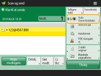 Bestemmelse af originalens top og bundDu kan indstille dokumentets retning inden scanning, så dokumentets top og bund er placeret korrekt, når den sendte/gemte fil vises på en computer. Når du anbringer en original i A4-format, skal du trykke på <Tilvalg> på skærmbilledet Grundlæggende scanningsfunktioner <Øverst ved fjern kant> <Orig. indhold Retning> <OK>.Når du anbringer originaler i stort format som f.eks. A3-format, skal du trykke på <Tilvalg> på skærmbilledet Grundlæggende scanningsfunktioner <Orig. indhold Retning> vælg <Øverst ved fjern kant> eller <Øverst ved kant> alt efter retningen af originalen tryk på <OK>.Angivelse af flere modtagere, inklusive faxerIndstiller du <Aktivér fax i scanningsog sendefunktion> til <Til>, kan du angive faxmodtagere fra skærmbilledet Grundlæggende scanningsfunktioner (<Vis faxfunktion>). Denne indstilling er praktisk til angivelse af flere modtagere inklusive faxer, som f.eks. når du gemmer en kopi af en sendt fax på en filserver. Tjek af scannede originaler inden afsendelse/lagringDu kan tjekke scannede originaler på eksempelskærmen inden afsendelse/lagring. Kontrol af scannede originaler inden afsendelse/lagring (Eksempel) Registrering af ofte anvendte indstillingerDu kan kombinere ofte anvendte modtagere og scanningsindstillinger på en knap på maskinen til senere brug. Ved at trykke på den registrerede knap, når du scanner originaler, kan du hurtigt færdiggøre dine indstillinger. Registrering af en kombination af ofte anvendte funktioner |