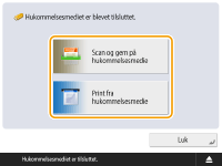 Hvis <Angiv mulighed, når hukommelsesmedie tilsluttes> er indstillet til <Til>, vises genveje til de tilgængelige funktioner, når du indsætter hukommelsesmedier. <Angiv mulighed, når hukommelsesmedie tilsluttes> ![]() Eftersom genvejene muligvis ikke vises, hvis maskinen er i dvaletilstand, skal du indsætte hukommelsesmediet, efter maskinen er returneret fra dvaletilstand. |