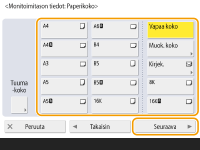 1 | Valitse <Muokattu koko>. ![]() Voit määrittää paperikooksi <Vapaa koko>, mikä poistaa tarpeen määrittää paperikokoasetukset. Määritä <Vapaa koko>, kun lisäät tuntematonta paperikokoa käytettäväksi kopioinnissa tai kun paperikoko on jo tallennettu tulostinajuriin. |