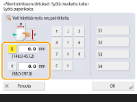 Valitse kummankin sivun pituus numeropainikkeilla valitsemalla <X> tai <Y>. ![]() Kun tallennat usein käyttämäsi paperikoot painikkeille <S1>–<S4>, voit käyttää niitä yhdellä painalluksella. Vapaan paperikoon (Muokattu paperikoko) tallentaminen | |