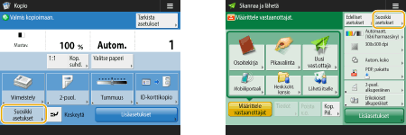 Voit vaihtaa asetuspainikkeet, jotka näkyvät perustoimintojen näytössä (kopio, faksi ja skannaus). Voit myös näyttää kullekin kirjautuneelle käyttäjälle mukautetut perustoimintojen näytöt.