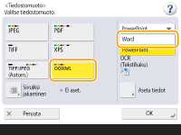 1 | Valitse <OOXML> valitse <Word> avattavasta luettelosta.![]() ![]() Vaihda OCR-kieli valitsemalla <Aseta tiedot> <Muuta> valitse kieli tai kieliryhmä valitse <OK>.Valitse kieli tai kieliryhmä sen mukaan mitä kieltä käytetään skannatuissa asiakirjoissa. |