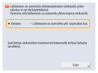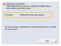 Jos virhe ilmenee skannauksen tai tulostuksen aikana, tai jos ongelma tapahtuu verkkoyhteydessä tai asetuksissa, viesti ilmestyy laitteen näyttöön tai Remote UI (Etäkäyttöliittymä) -sovellukseen. Tietoja kustakin viestistä ja ongelmien ratkaisuista, katso allaolevat viestit. Jos laite näyttää sisäänkirjautuessa kuusinumeroisen luvun, katso kohta