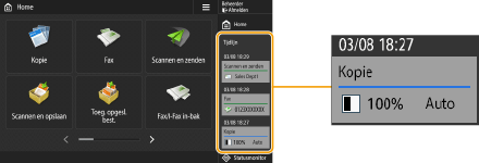 Met deze knoppen kunt u de schermen voor basisfuncties zoals "Kopie" en "Scannen en verzenden" openen.