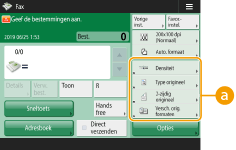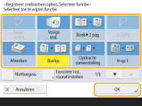 Het aantal instellingen op het scherm met basisfuncties en de plaats waar ze worden weergegeven, kan verschillen afhankelijk van hun functies. Er wordt geen sneltoets weergegeven als <Niet-toegewezen> is ingesteld als een sneltoets. De limiet voor het aantal sneltoetsen voor <Opties> dat u kunt registreren is als volgt. Kopiëren: 5 Fax: 4 Scannen en verzenden: 2 |