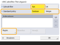 Stel <Gebruik filter> in op <Aan>, selecteer <Standaard policy> en druk vervolgens op <Registreren>.