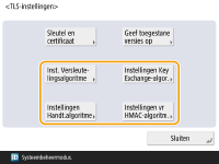 Als u een sleutel en certificaat wilt gebruiken die u zelf hebt gegenereerd, moet u sleutel en certificaat genereren voordat u onderstaande procedure uitvoert. Sleutel en certificaat voor netwerkcommunicatie genereren Als u een sleutel en certificaat wilt gebruiken die u ophaalt bij een certificeringsinstantie, moet u eerst sleutel en certificaat registreren voordat u onderstaande procedure uitvoert. Een sleutel en certificaat registreren Als u <Stel de encryptiemethode in op FIPS 140-2> instelt op <Aan>, kunt u ervoor zorgen dat de TLS-communicatieversleutelingsmethode voldoet aan de door de Amerikaanse overheid goedgekeurde FIPS (Federal Information Processing Standards) 140-2. <Stel de encryptiemethode in op FIPS 140-2> Als <Stel de encryptiemethode in op FIPS 140-2> is ingesteld op <Aan>, treedt er een fout op wanneer u probeert een certificaat voor TLS op te geven dat gebruikmaakt van een algoritme dat niet wordt herkend door FIPS (minder dan RSA 2048-bits). Er treedt een communicatiefout op als u <Stel de encryptiemethode in op FIPS 140-2> instelt op <Aan> en verzendt naar een andere partij die geen ondersteuning biedt voor door FIPS herkende versleutelingsalgoritmen. Als <Stel de encryptiemethode in op FIPS 140-2> is ingesteld op <Aan>, <CHACHA20-POLY1305> en <X25519> schakel over naar <Uit>. Als <CHACHA20-POLY1305> of <X25519> is ingesteld op <Aan>, schakelt <Stel de encryptiemethode in op FIPS 140-2> over naar <Uit>. |