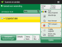 Voor het bekijken van het totale aantal gespecifieerde bestemmingenBoven in het scherm wordt het totaal aantal gespecificeerde bestemmingen weergegeven. Zo kunt u voor verzending bevestigen dat het aantal bestemmingen correct is. Als u een opdracht die wordt verzonden onmiddellijk wilt annulerenAls u op  op het bedieningspaneel drukt terwijl een opdracht wordt verzonden, verschijnt het bericht <De volgende verzendopdracht annuleren?>. Druk op <Ja> om het verzenden te annuleren. Druk op  wanneer er meerdere verzendopdrachten zijn om het scherm weer te geven voor de selectie van de te annuleren verzendopdracht. Als de verzendopdracht die u wilt annuleren niet wordt weergegeven, drukt u op <Contr. andere opdr.> om <Verzendopdrachten> weer te geven. Selecteer de opdracht die u wilt annuleren en druk op <Annuleren>. Controleren van de status van verzonden/opgeslagen documentenOp het scherm <Statusmonitor> kunt u de status controleren van verzonden/opgeslagen documenten. Op dit scherm kunt u documenten na het controleren van de status opnieuw verzenden/opslaan of het verzenden/opslaan annuleren. Status en logboek voor gescande documenten controlerenWanneer <Toon melding als taak is geaccepteerd> is ingesteld op <Aan>, kan het scherm <Statusmonitor> worden weergegeven vanaf het volgende scherm dat wordt weergegeven nadat een verzendopdracht wordt ontvangen. <Toon melding als taak is geaccepteerd>Afdrukken van het rapport met verzend-/opslagresultatenAls u op het scherm met basisfuncties voor scannen op <Opties>  <TX-resultaatrapport> drukt, kunt u instellen dat het rapport met verzend-/opslagresultaten automatisch wordt afgedrukt. Als u dit voor elke opdracht wilt instellen vanaf <Opties>, moet u <Alleen bij fout> of <Uit> selecteren in <TX-resultaatrapport> en vervolgens <Afdrukken uit opties toestaan> instellen op <Aan>. BestandsnaamWanneer een bestand wordt verzonden/opgeslagen, wordt zijn bestandsnaam automatisch ingesteld op basis van de volgende indeling. U kunt de instelling wijzigen, zodat een andere naam kan worden toegewezen. Een bestandsnaam instellenBij verzending via e-mail Indeling "Opdrachtnummers (vier cijfers)_paginanummers (drie cijfers).bestandsextensienaam", bijvoorbeeld "1042_001.jpg". Bij opslag op een bestandsserver Indeling "Jaar, maand, dag, uur, minuut en seconde waarop het bestand is opgeslagen (14 cijfers).bestandsextensienaam", bijvoorbeeld "20151030133541.jpg". E-mailonderwerpHet onderwerp dat is ingevoerd bij <Standaardonderwerp> wordt automatisch ingesteld ( <Standaardonderwerp>). Als u een ander onderwerp opgeeft, wijzigt u de instelling of geeft u het tijdstip op waarop u een e-mail verzendt ( E-mailinstellingen opgeven). |