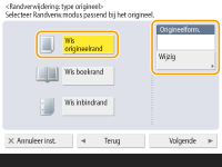 <Wis rand>.1 | Druk op <Wis origineelrand> en controleer <Origineelform.>. ![]() Als het formaat bij <Origineelform.> afwijkt van het formaat van het origineel, druk dan op <Wijzigen> om het formaat te selecteren. Alleen de origineelformaten op het aanraakscherm kunnen worden gescand. |
