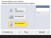 1 | Druk op <Wis boekrand> en controleer <Origineelform.>. ![]() Als het formaat bij <Origineelform.> afwijkt van het formaat van het boek, druk dan op <Wijzigen> om het formaat te selecteren. Alleen de origineelformaten op het aanraakscherm kunnen worden gescand. |