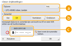 Als u de instelling van <Tijdzone> of <Zomertijd> hebt gewijzigd, moet u de machine herstarten door de stroom uit te schakelen. Schakel de machine uit met de hoofdschakelaar ( De machine uitzetten). Het aanraakscherm en de indicatoren gaan uit. Wacht minstens 10 seconden en schakel de machine weer in ( De machine aanzetten). |