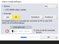 Geef de datum en tijd van de machine op. ![]() ![]() Voer de datum en tijd in en druk op <OK>. Stel zo nodig <Tijdzone> en <Zomertijd> in. Voor meer informatie raadpleegt u De datum/tijd instellen. | |
