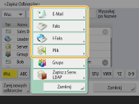 Jeżeli serwer LDAP został już zarejestrowany w urządzeniu (Rejestracja serwera LDAP), nie możesz wyszukiwać odbiorców i rejestrować ich w Książce adresowej. Naciśnij kolejno <Ustawienia odbior./przeka.> <Zapisz Odbiorców> <Zarej.nowych odbiorców> <Zapisz z Serw. LDAP> i wyszukaj odbiorców za pomocą polecenia <Wyszukaj po Warunk.>.W sytuacji gdy zarówno nazwa użytkownika, jak i hasło są poprawne, jednak nie ma żadnych wyników wyszukiwania, należy sprawdzić ustawienie godziny na serwerze LDAP i urządzeniu. Jeżeli godzina ustawiona na serwerze LDAP różnic się od godziny ustawionej w urządzeniu o więcej, niż pięć minut, nie można przeprowadzać wyszukiwania. Jeżeli w wynikach wyszukiwania wyświetlanych jest kilku odbiorców, można zarejestrować maksymalnie 256 odbiorców jednocześnie. Informacje, które można otrzymać za pośrednictwem serwera LDAP składają się jedynie z nazw oraz numerów/adresów faksów. W razie konieczności zarejestruj inne informacje przez <Szczegóły/Edytuj>. Nie można jednocześnie wyszukiwać odbiorców na serwerze LDAP zarówno z poziomu panelu sterowania, jak i interfejsu Remote UI (Zdalny interfejs użytkownika). Podczas wyszukiwania odbiorców na serwerze LDAP z poziomu panelu sterowania urządzenia można określić cztery warunki wyszukiwania. Natomiast podczas wyszukiwania odbiorców na serwerze LDAP z poziomu interfejsu Remote UI (Zdalny interfejs użytkownika) można określić tylko jeden warunek wyszukiwania. Może być konieczne wprowadzenie nazwy użytkownika i hasła. Wprowadź nazwę użytkownika i hasło urządzenia, zarejestrowane na serwerze LDAP. Jeśli informacje uwierzytelniające nie są używane, wyszukaj za pomocą pól dla nazwy użytkownika i hasła w interfejsie Remote UI (Zdalny interfejs użytkownika). Określanie/rejestrowanie odbiorców z historii wysyłaniaMożesz określić odbiorców i zarejestrować ich w książce adresowej z poziomu historii wysyłania na ekranie <Monitor stanu>. Ogranicza to wysiłek bezpośredniego wprowadzania adresu, a także pomaga uniknąć wysyłania do nieprawidłowego odbiorcy z powodu wprowadzenia nieprawidłowego adresu. W przypadku określania odbiorcy: <Monitor stanu> <Wyślij> <Rejestr zadania> wybierz odbiorcę, do którego chcesz wysłać <Wprow. jako odbiorca wysył.> <OK>W przypadku rejestrowania odbiorcy: <Monitor stanu> <Wyślij> <Rejestr zadania> wybierz odbiorcę, którego chcesz zarejestrować <Zarejestruj odbiorcę> zarejestruj odbiorcę z ekranu rejestracji dla każdego typu odbiorcySprawdzanie statusu i rejestru wysłanych i odebranych dokumentów Sprawdzanie statusu i rejestru zeskanowanych dokumentów |