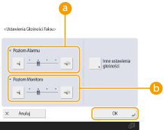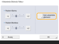 Można wyregulować poziom głośności poszczególnych dźwięków emitowanych przez urządzenie podczas wysyłania/odbierania faksu. Poza możliwością ustawienia dźwięków faksu, można określić czy urządzenie ma emitować dźwięki w przypadku konieczności potwierdzenia lub w przypadku ostrzeżeń.