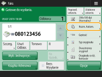 Sprawdzanie całkowitej liczby określonych odbiorcówCałkowita liczba określonych odbiorców jest wyświetlana na górze ekranu. Umożliwia to potwierdzenie przed wysłaniem, czy liczba odbiorców jest prawidłowa. ![]() Aby wysyłać wraz z informacjami o nadawcy.Możesz dołączyć do wysyłki informacje o nazwie nadawcy i numer faksu. <ID Terminala TX> Sprawdzanie statusów wysłanych dokumentówNa ekranie <Monitor stanu>, możesz sprawdzić statusy wysłanych dokumentów. Ten ekran umożliwia ponowne wysyłanie faksów lub anulowanie wysyłania po sprawdzeniu statusów. Sprawdzanie statusu i rejestru wysłanych i odebranych dokumentów Jeżeli dla opcji <Wyświetl powiado. gdy zadanie zostało zaakceptowa.> wybrano ustawienie <On>, ekran <Monitor stanu> można wyświetlić z poziomu poniższego ekranu wyświetlanego po odebraniu wysłanego zadania. <Wyświetl powiado. gdy zadanie zostało zaakceptowa.> ![]() Jeżeli wystąpi błąd transmisji ze względu na to, że linia odbiorcy jest zajętaUrządzenie automatycznie ponowi wybieranie numeru po upływie określonego czasu. Istnieje możliwość zmiany ustawienia liczby ponownych prób łączenia i przerwy między kolejnymi łączeniami. <Automatyczne ponowne wybieranie> Drukowanie raportu wyników wysyłaniaNa ekranie Podstawowych funkcji faksowania, naciśnij kolejno <Opcje> <Raport wyniku TX>, aby ustawić automatyczne drukowanie raportu z listą wyników wysyłania.By ustawić to dla każdego zadania z <Opcje>, należy wybrać <Tylko dla Błędu> lub <Wyłącz> w <Raport wyniku TX>, a następnie ustawić <Zezwól na drukowanie z opcji> na <Włącz>. Gdy ustawiono wiele linii telefonicznychIstnieje możliwość wyboru linii telefonicznej wykorzystywanej do wysyłania faksów poprzez naciśnięcie <Opcje> <Wybór Linii>. Aby uzyskać instrukcje dotyczące określania ustawień linii faksu, patrz Ustawienia linii faksu. |