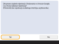 Rejestracja za pomocą urządzenia mobilnego albo przeglądarki Google ChromeIstnieje także możliwość rejestracji urządzenia za pomocą urządzenia mobilnego albo przeglądarki Google Chrome. Przed zakończeniem rejestracji na ekranie urządzenia zostanie wyświetlony następujący ekran potwierdzenia. Naciśnij przycisk <Tak>, aby ukończyć rejestrację. Informacje na temat metod rejestracji, patrz podręcznik Twojego urządzenia albo główna strona internetowa usługi Google Cloud Print. |