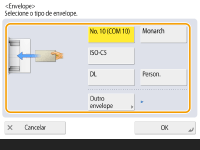 2 | Selecione o tipo de envelopes. ![]() Para gravar um envelope de formato personalizado, carregue em <Person.> <Seguinte> e carregue em <X> ou <Y> para especificar o lado; em seguida, utilize as teclas numéricas para introduzir o comprimento do lado especificado. |