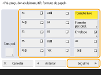 1 | Carregue em <Formato person.>. ![]() Pode especificar o formato de papel como <Formato livre>, que elimina a necessidade de introduzir a programação de formato de papel. Especifique <Formato livre> quando colocar papel de formato desconhecido para utilizar para cópia ou quando o formato de papel já estiver gravado no controlador de impressora. |