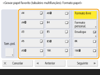 Se programar <Especificar sempre> em <Pré-programações tabuleiro multifunções> para <Papel favorito>, aparece um ecrã que permite selecionar o seu "Papel favorito" quando colocar papel no tabuleiro multifunções. <Pré-programações tabuleiro multifunções> |
