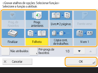 O número de itens de programação que se encontra no ecrã das funções básicas e a localização a ser apresentada diferem dependendo das funções. Não é apresentado nenhum botão de atalho se <Não atribuídos> for programado como atalho. O limite de atalhos para <Opções> que pode gravar é o seguinte. Copiar: 5 Fax: 4 Ler e Enviar: 2 |