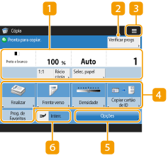 Apresenta o estado das programações, como o rácio de cópia, o formato de papel e o número de cópias. Não se esqueça de confirmar as programações para uma cópia correta. Para alterar as programações, carregue no botão sob a secção de apresentação.