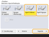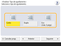 Dependendo das funções de finalização, poderá ser necessária a instalação de dispositivos opcionais. Equipamento opcionalQuando configurar programações em <Aced.fich. guardados>Só pode utilizar as funções de acabamento quando imprimir ficheiros PDF/XPS. |