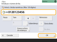 Para enviar faxes internacionaisIntroduza o número de acesso internacional, o indicativo do país e o número de fax, por esta ordem. Se não for possível estabelecer ligação com êxito ao destino internacional, carregue em <Pausa> para inserir uma pausa entre um número e o número seguinte. Para enviar faxes com um subendereçoA máquina suporta a utilização de subendereços das normas ITU-T*. Se a máquina de fax do destinatário for compatível com a utilização de subendereços ITU-T, é possível aumentar a confidencialidade dos documentos enviados, utilizando um subendereço e uma palavra-passe. Para enviar um documento com um subendereço, introduza um número de fax, carregue em <Subendereço> ou <Especificar detalhes> e introduza o subendereço e a palavra-passe. * Corresponde a International Telecommunication Union-Telecommunication Standardization Sector, o grupo que elabora recomendações destinadas à normalização das telecomunicações a nível mundial. |
