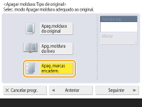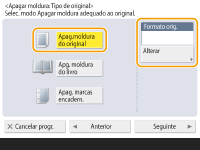 <Apag.moldura>.1 | Carregue em <Apagar moldura do original> e verifique <Formato orig.>. ![]() Se o formato apresentado em <Formato orig.> for diferente do formato do original, carregue em <Alterar> para selecionar o formato. Só é possível ler os formatos de original mostrados no visor do painel digital. |