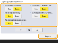 <Тон спящего режима> | Звук, воспроизводимый, когда аппарат входит в режим сна или выключается, если установлено <Парам. быстрого запуска для осн. питания> для <Вкл.>. (В некоторых ситуациях быстрый запуск аппарата не выполняется и звуковой сигнал не подается.) |