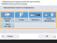 Количество элементов на экране основных функций и порядок их отображения отличается в зависимости от функции. Кнопка быстрого вызова не отображается, если в качестве кнопки быстрого вызова установлено <Не назначено>. Ниже указаны ограничения для числа клавиш быстрого вызова для <Параметры>, которые можно зарегистрировать. Копирование: 5 Факс: 4 Сканировать и отправить: 2 |