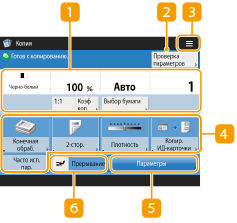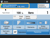 В этой области отображается настроенное значение, например коэффициент масштабирования, формат бумаги и количество копий. Подтвердите параметры, чтобы копирование было выполнено должным образом. Для изменения значений нажмите кнопку, расположенную под этой областью.