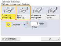 В зависимости от функции конечной обработки может потребоваться установить дополнительное оборудование. Параметры В зависимости от типа бумаги функции конечной обработки могу быть недоступны. Технические характеристики аппаратного обеспечения При помещении оригинала на стекле экспонированияЧтобы воспользоваться функцией сортировки и группировки копий оригинала, помещенного на стекло экспонирования, на экране основных функций копирования последовательно нажмите <Параметры> <Составление задания>.Во время копирования с группированием копий между каждой страницей следует вставить разделитель заданийЕсли выбран вариант <Группа (те же стр.)>, между каждой группой копий можно вставить разделитель заданий. Дополнительные сведения см. в разделе <Разделитель заданий между группами>. <Копия> <Разделитель заданий между группами>При настройке параметров в <Доступ к сохр.файлам>Функции окончательной обработки можно использовать только при печати PDF- или XPS-файлов. |