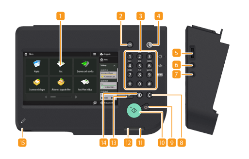 Blinkar när funktioner som sänd eller utskrift utförs. Lyser med grönt sken när det finns original som väntar på att bearbetas.