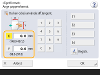Tryck på <X> eller <Y> för att ange längden på varje sida med sifferknapparna. ![]() Om du registrerar pappersformat du använder ofta på knappar <S1> till <S4> kan du enkelt hämta dem med ett knapptryck. Registrera papper i fritt format (Eget format) | |